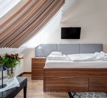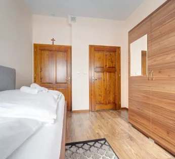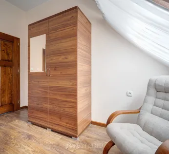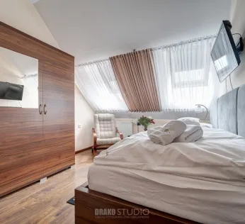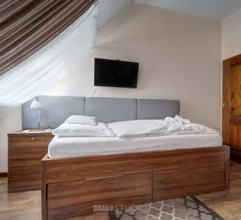 Do Twojej dyspozycji oddajemy wygodne łóżko, fotel idealny do relaksu oraz przestrzeń, która zapewni Ci prywatność i wygodę. Pokój posiada również własną łazienkę z prysznicem, która gwarantuje komfort i pełną niezależność podczas pobytu.